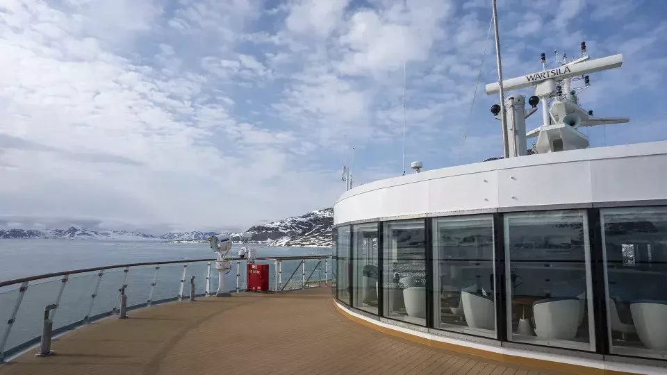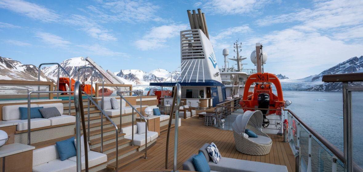 X-Bow for more stability and comfort; Highest Polar code Class 6; Highest Ice Class 1A; 4 diesel engines and 2 electro engines; Solas 2012 classification; Environmentally friendly in all matters; Green initiative program; Bar Lounge; Shop; Observation Lounge; Observation Sliders; Polar Spa / Wellness Area / Gym; Modern lecture lounge; All staterooms with Ocean View; Restaurant on Deck 5; Observation Speciality Restaurant on Deck 9; Swimming Pool, jacuzzies and Pool Bar.